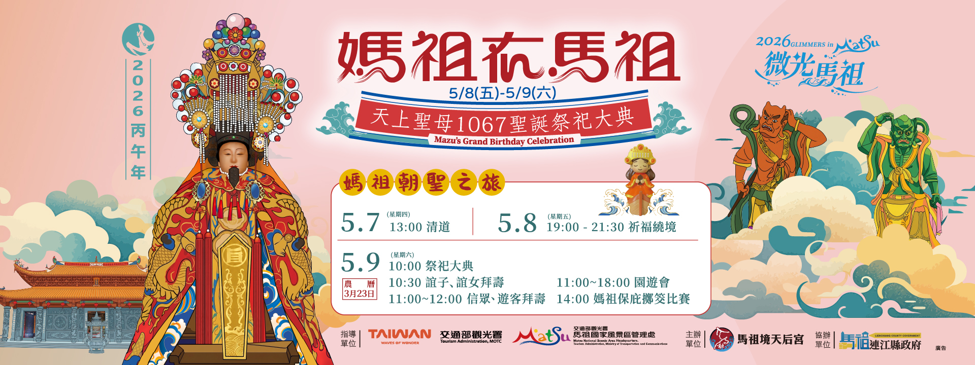 旧暦3月23日は、世界中の媽祖信仰者にとって最も重要な日です。今年も馬祖国家風景区管理処と馬祖境天后宮が連携し、「媽祖は馬祖に」をテーマに、荘厳で賑やかな誕生祭を開催します。